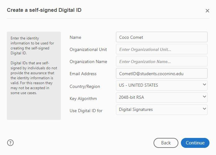 NOTE: Once your signature is created you will be able to use it on all of our PDF forms. Please take note of your Password. If you forget your password you will need to create a new digital ID. If you are using a public computer we recommend that you delete the signature/form once submitted through the Financial Aid Secure Upload.