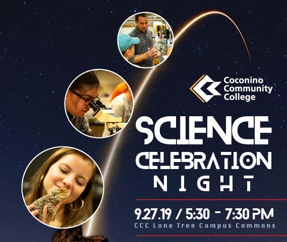 Everyone is invited to attend the FREE CCC Science Celebration Night 5:30 – 7:30 p.m., Friday, September 27, 2019 at the Coconino Community College Lone Tree Campus, 2800 S. Lone Tree Road, Flagstaff.