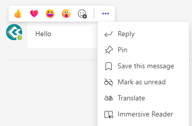 Hovering over a message allows access to react with Emojis, replying, pinning, saving, marking as unread, translating, and opening in an immersive reader.