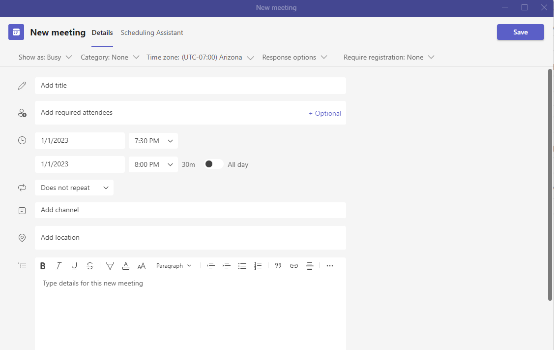 A window will appear to enter the details of the meeting. Enter the details and select "Save" to schedule the meeting.