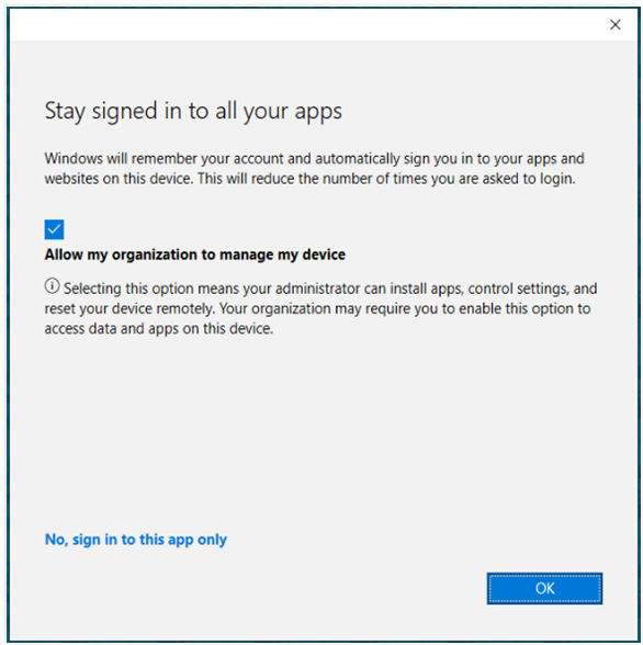 NOTE: For personal devices, ITS recommends unchecking the box and selecting "No, sign in to this app only."